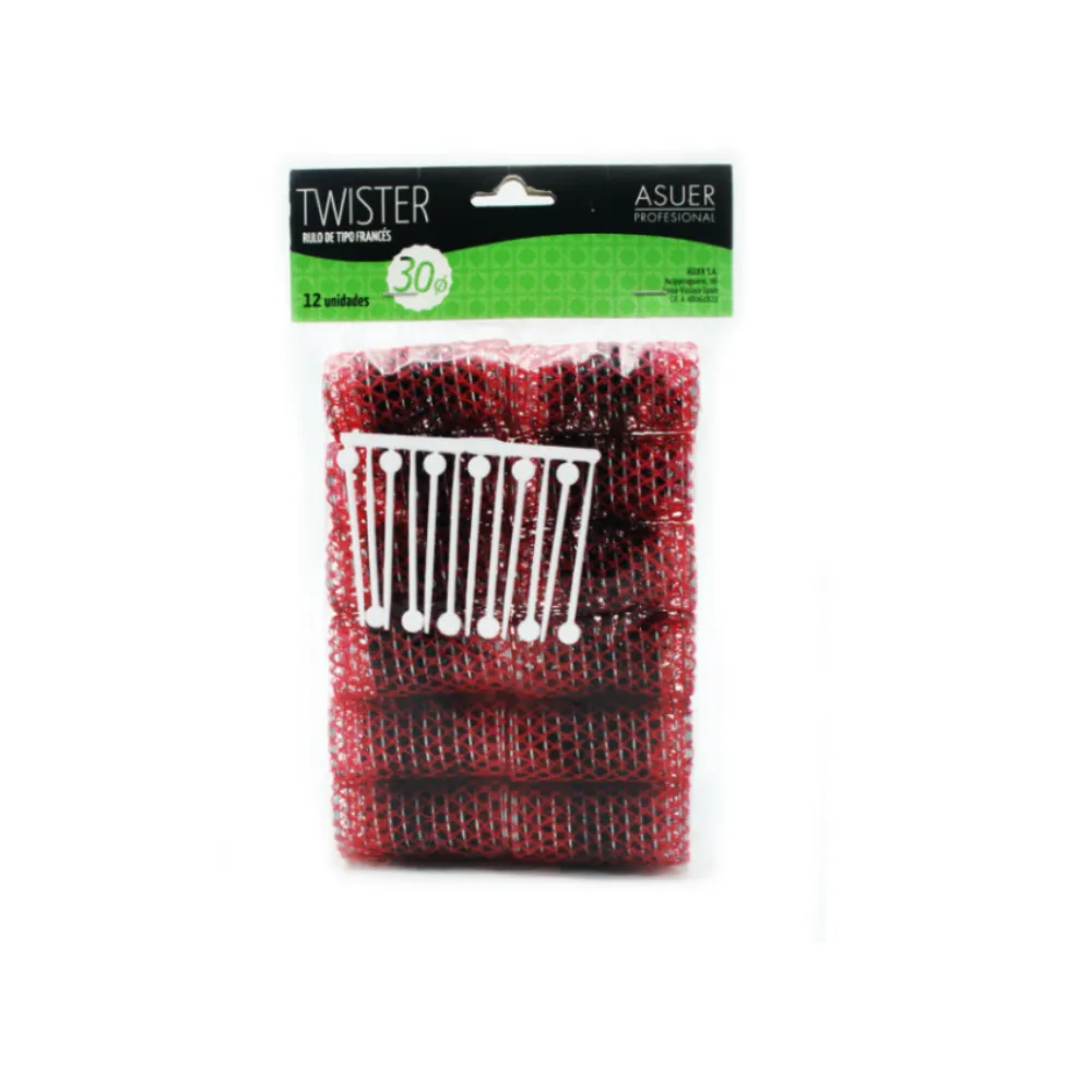 Rulos tipo francés Asuer Twister de 30 mm ideales para crear rizos definidos y flexibles sin calor. Su diseño permite una fijación cómoda y segura, perfectos para uso profesional y doméstico. Aportan volumen y forma de manera uniforme.